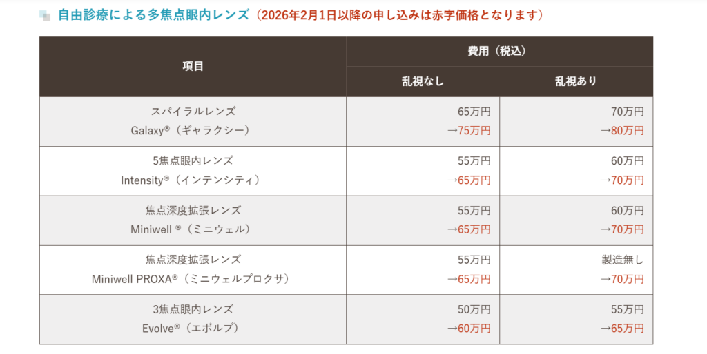 2026年2月より下記の価格とさせていただきます。これらのレンズを検討されている方は、2026年1月まででしたら現行価格での白内障手術が可能です。お早めにご相談ください。