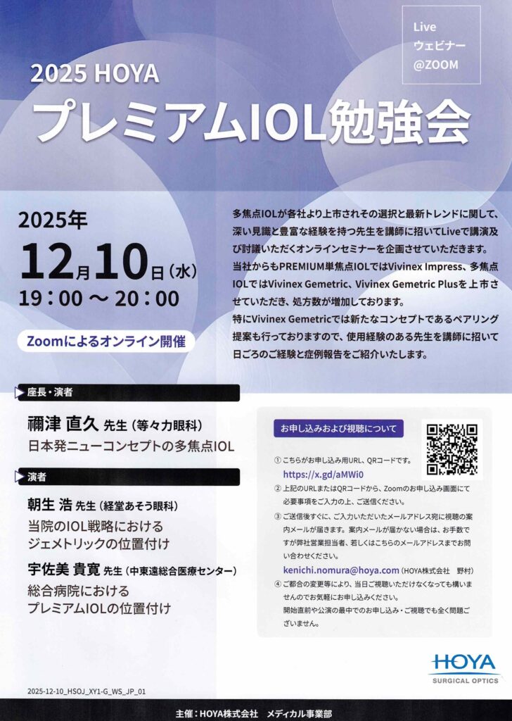 2025年12月10日に、HOYA社主催のプレミアムIOL勉強会にて、朝生院長が多焦点眼内レンズ「ジェメトリック」に関するWeb講演を行いました。ジェメトリック・ジェメトリックプラスの当院における成績やレンズの性能や今後の可能性について演者間でもお話しさせていただきました。講演の機会を頂き大変感謝しております。