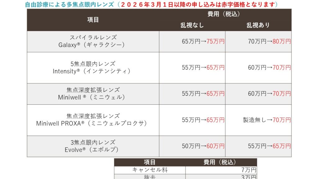 2026年3月より下記の価格とさせていただきます。これらのレンズを検討されている方は、2026年1月まででしたら現行価格での白内障手術が可能です。お早めにご相談ください。